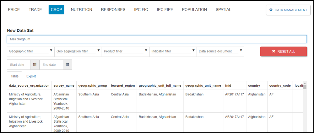 Once can search for a specific data points of the data series from the list available in the system.To search for the specific data points of the data series of the crop data domain, one can use any of the column information (i.e Country , Product , Season ,Indicator etc.) displayed on the header of the data domain.