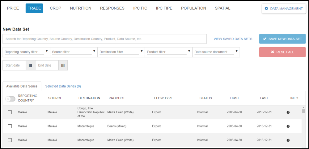It is a data domain which allows user to view, search, filter cross border trade data.It is a data domain which enables users to view the trade data in tabular or chart formats. To open the data domain, click on the TRADE tab from the top side menu of the Data Explorer main page. The Trade Data Series view page will be opened.