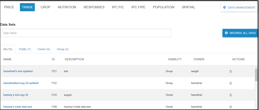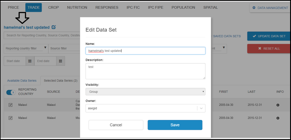 To update or edit any of the parameters of the saved data sets , click on the button VIEW SAVED DATA SETS button from the data series view page. List of the available data sets will be shown.