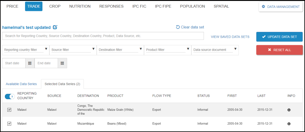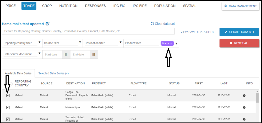 If one wants to add/remove the selected data series or add/remove the filter criteria from the saved data set. Check/uncheck the check box which is found in front of each records of the data series or select any of the criteria from the filter drop downs and click the UPDATE DATA SET button.