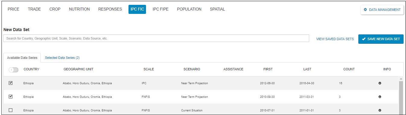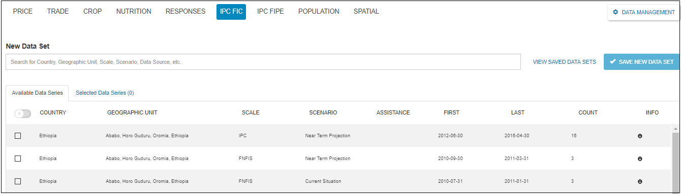 As it can be seen on the above screen-shot, the data domain has two tabs. The first is the Available Data Series which contains all the list of the data series of the IPC FIC data domain and the other is the Selected Data Series which contains the list of the selected data series with their total count.