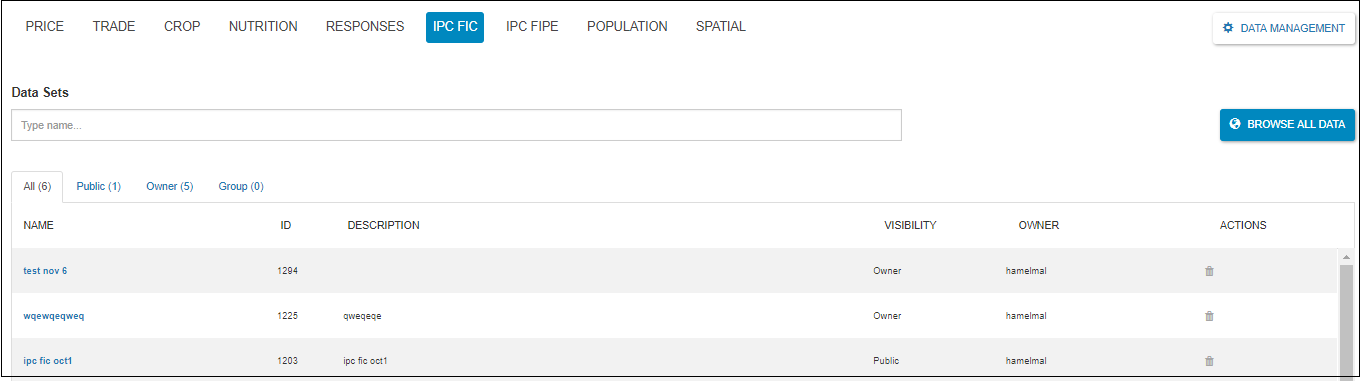 This page allows to view the available/saved data sets in the system.