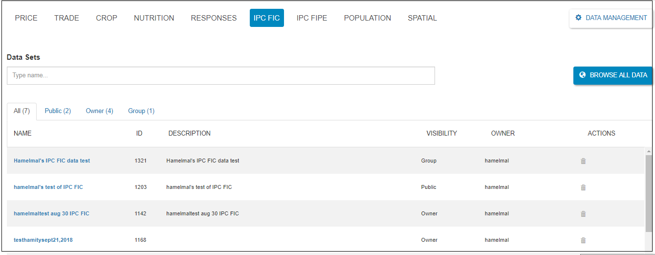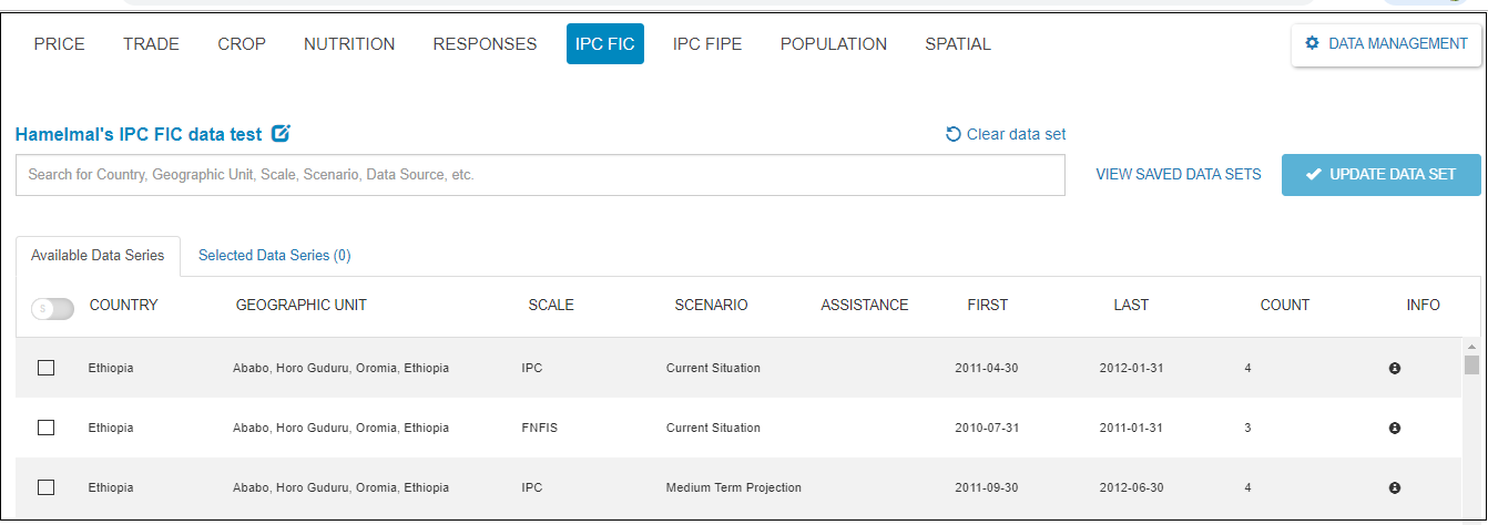 To update or edit any of the parameters of the saved data sets , click on the button VIEW SAVED DATA SETS button from the data series view page. List of the available data sets will be shown.