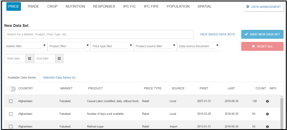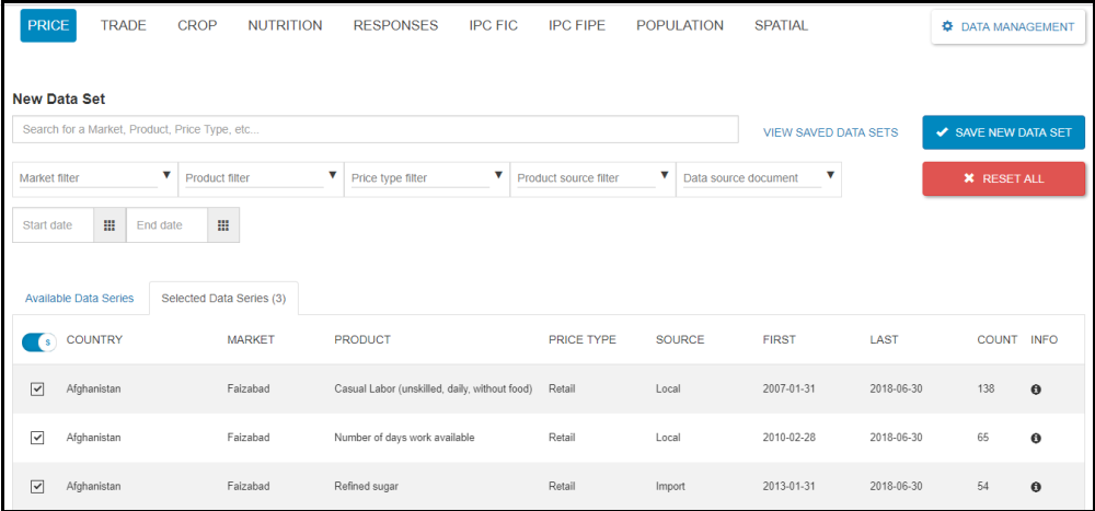 As it can be seen on the above screenshot, the data domain has two tabs. The first is the Available Data Series which contains all the list of the data series of the price data domain and the other is the Selected Data Series which contains the list of the selected data series with their total count.