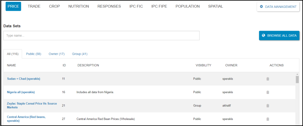 This page allows to view the available/saved data sets in the system.
