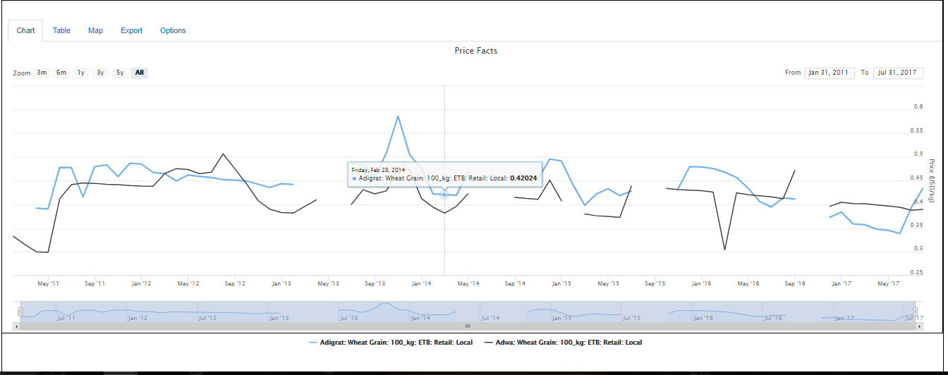 In order to view the data points of the selected data series in tabular format, Click the Table tab which is found at the bottom of the page.