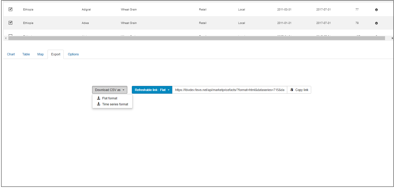 To download the data in CSV format ,click the Export tab which is found at the bottom of the page.Click the “Download csv as” drop down button to download the data and then the options Flat & Time series formats will pop up . The user can download the selected data either in Flat or Time series formats by clicking on either of the options ( Flat or Time series formats).