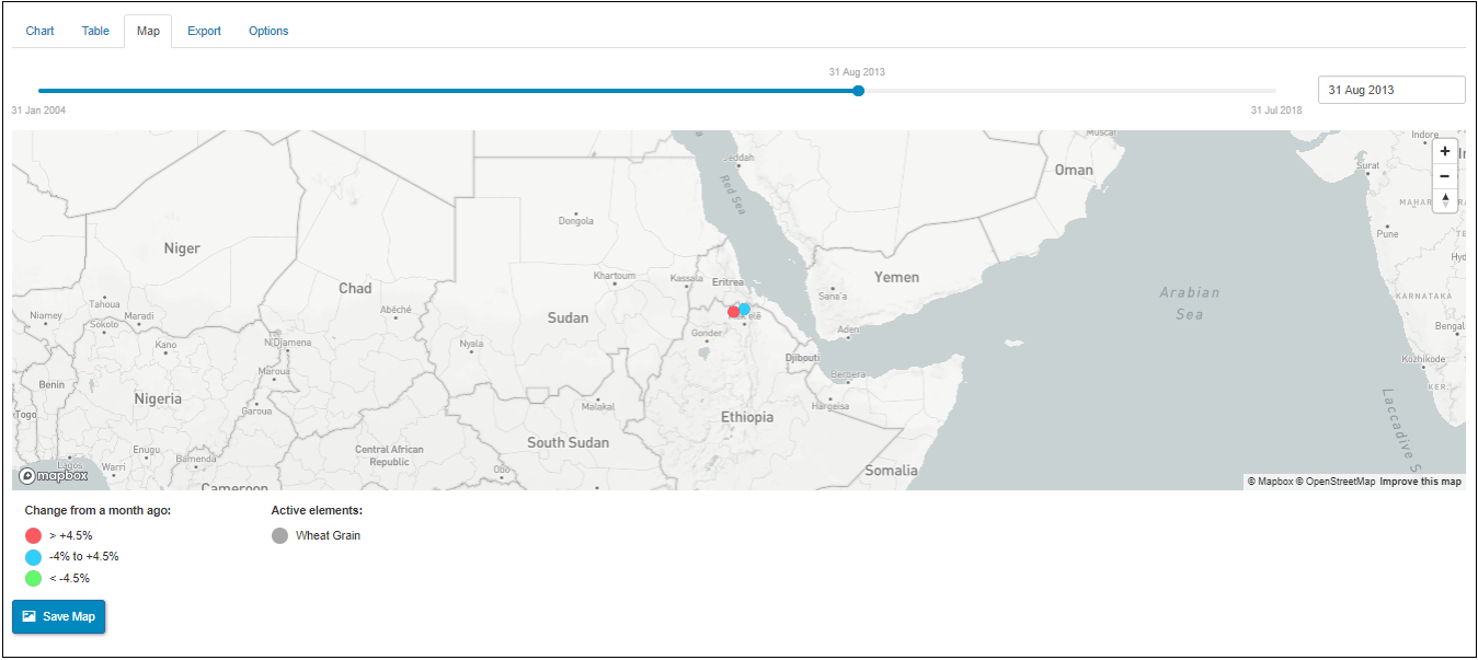Time slider contains the date range of the data points of the selected data series.It enables the user to visualize the data points of the selected data series by scrolling the slider’s tick back and forth. By clicking the Save map button, one can export the map into PNG format.