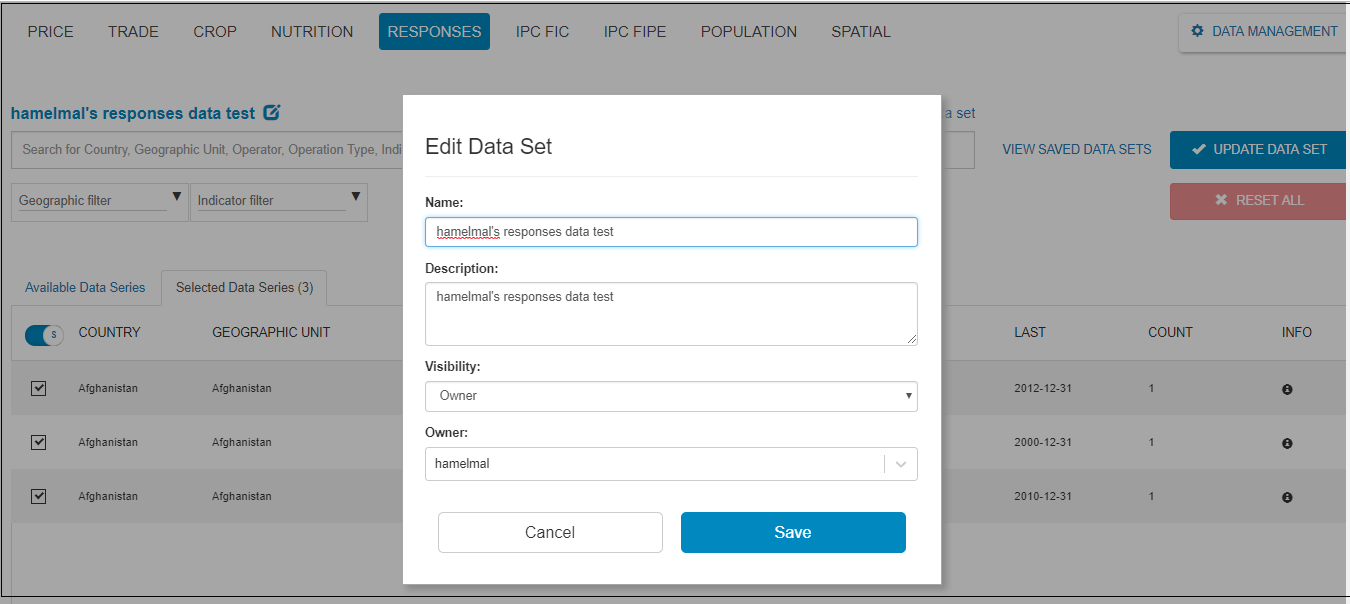 To update or edit any of the parameters of the saved data sets , click on the button VIEW SAVED DATA SETS button from the data series view page. List of the available data sets will be shown.
