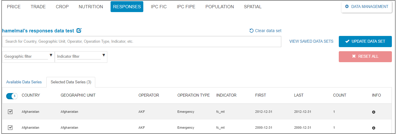 If one wants to add/remove the selected data series or add/remove the filter criteria from the saved data set. Check /Un-check the check box which is found in front of each records of the data series or select any of the criteria from the filter drop downs and click the UPDATE DATA SET button.