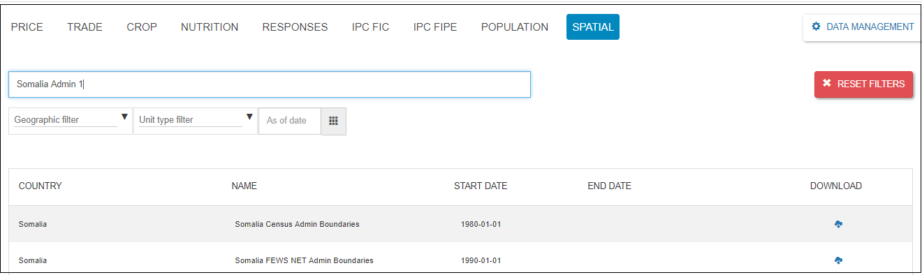 Once can search for a specific spatial data from the list available in the system.To search for the specific spatial data, one can use any of the column information (i.e Country, Unit Type,Data Source, etc.) displayed on the header of the data domain.