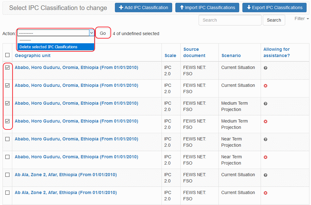 From the list of IPC Classifications page, click on the link within the Geographic unit column of the record you would like to delete.