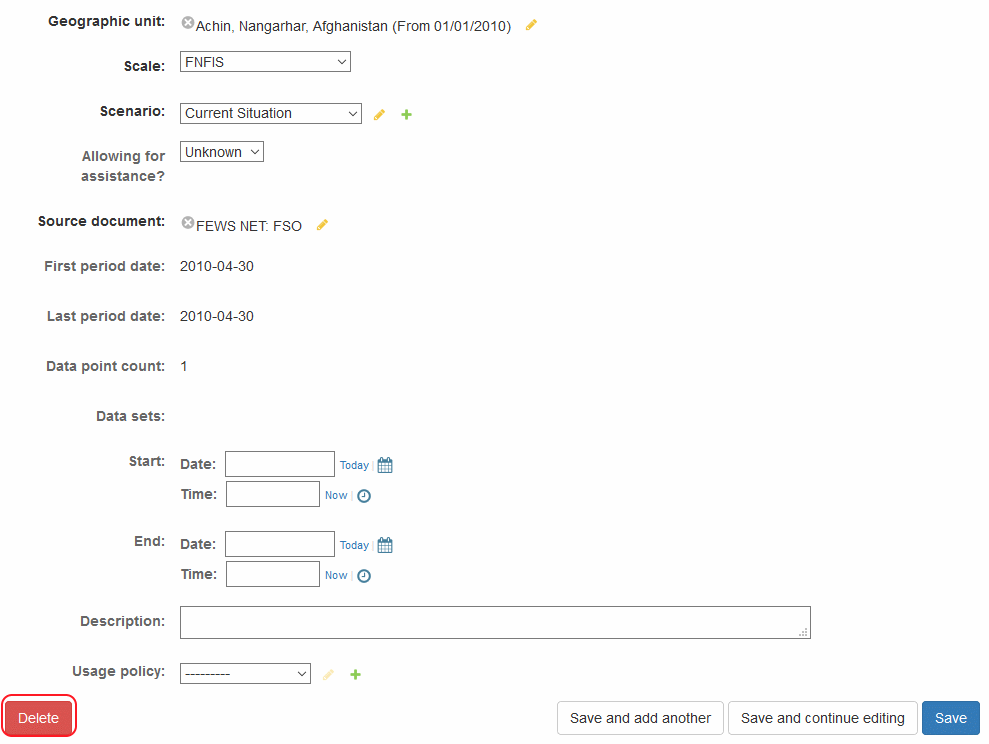 This is a screen where a user can add new IPC classifications data by providing the geographical unit, scale, scenario and the source document linked to the same. A user can also add a description.