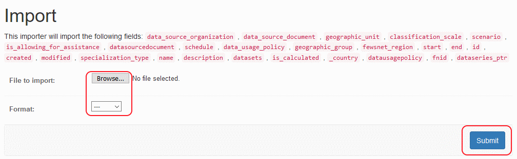 Users can upload/import a bulk file containing the columns: data_source_organization, data_source_document, geographic_unit, classification_scale, scenario, is_allowing_for_assistance, collection_date, start_date, period_date, datapoint_status, value, dataseries, datacollectionperiod, datacollection, collection_name, period_notes, id, created, modified, status, status_changed, specialization_type, description, high_value, ci95_low, ci95_high into the system using the Import functionality in the system.