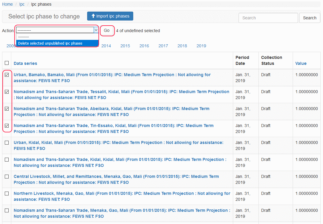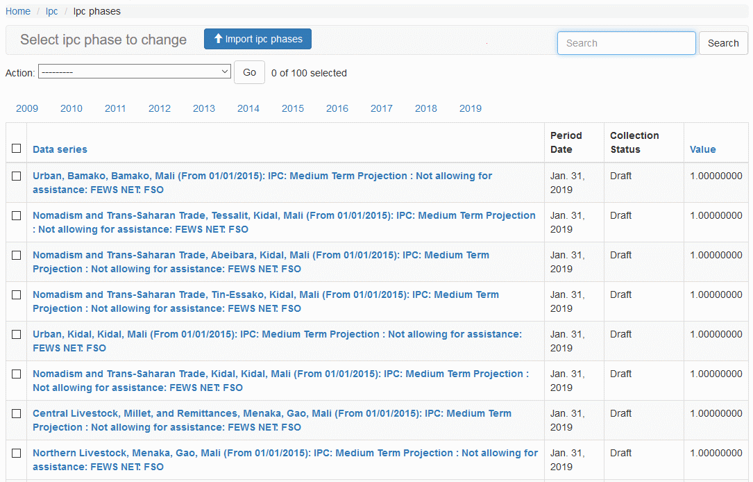The IPC Phase page lists the currently available IPC Phase datapoints in a grid format (see below) with column headers: Data series, Period Date, Collection Status, Value