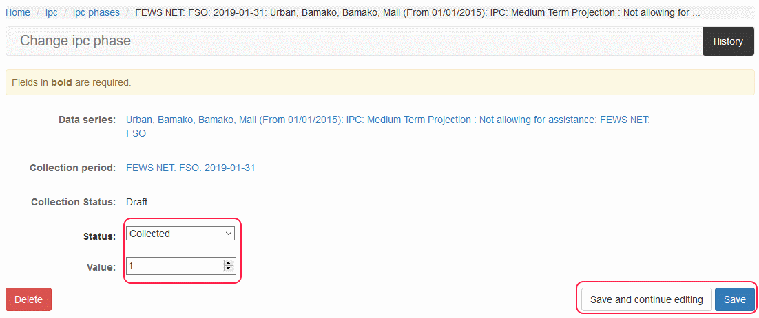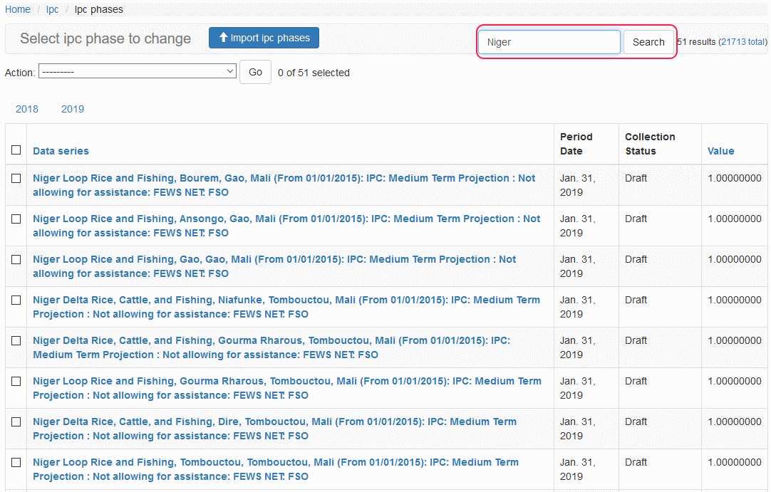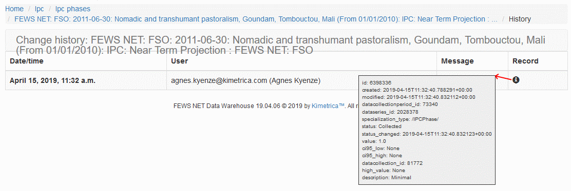 From the list in IPC Phase page, click on the link within the Data series column of the record you would like to view the history.
