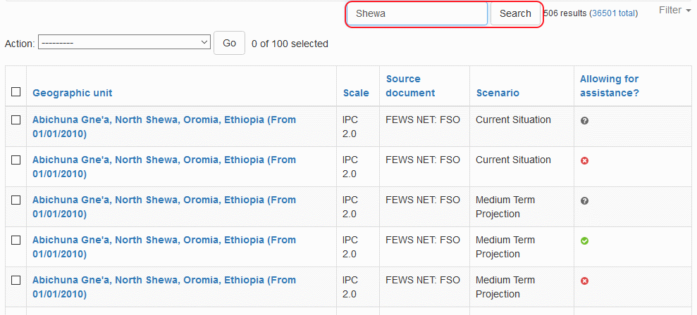 From the list of IPC Classifications page, click on the link within the Geographic unit column of the record you would like to view the history.