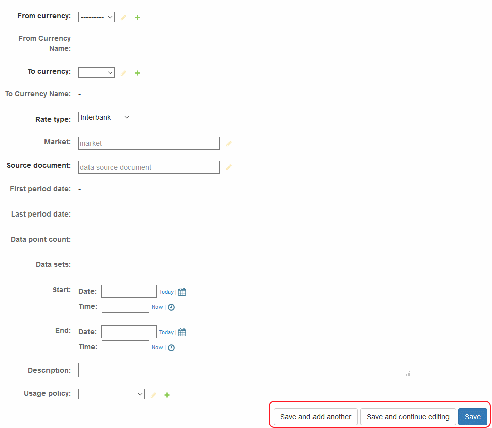 Save and add another - Saves the entered exchange rates information and provides an empty form to save another exchange rate data.