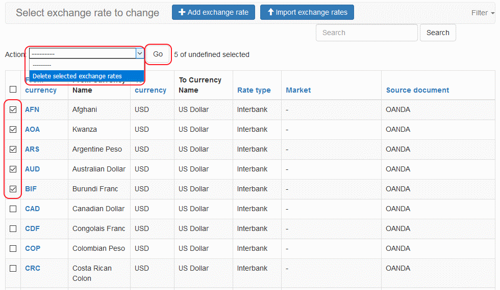 From the list of exchange rates page, select one or more exchange rates you would like to delete.