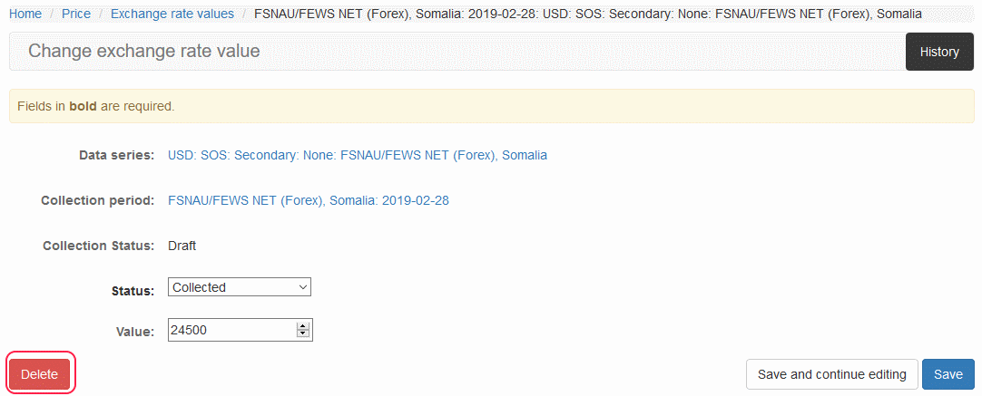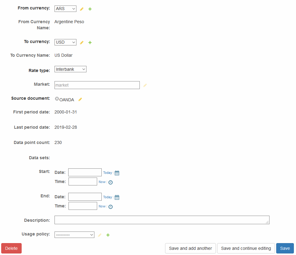 button at the bottom-left side of the page to delete the record.The system will open another page with summary information on the dataseries you are about to delete including a list of exchange rate datapoints that belong under the exchange rate you selected. It will also display a prompt with a confirmation message Are you sure? and provides you with