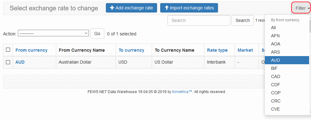 You can search the list by entering a search criteria in the Search text-box at the top of the exchange rate page and clicking on the