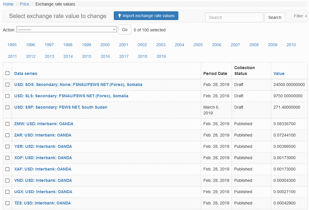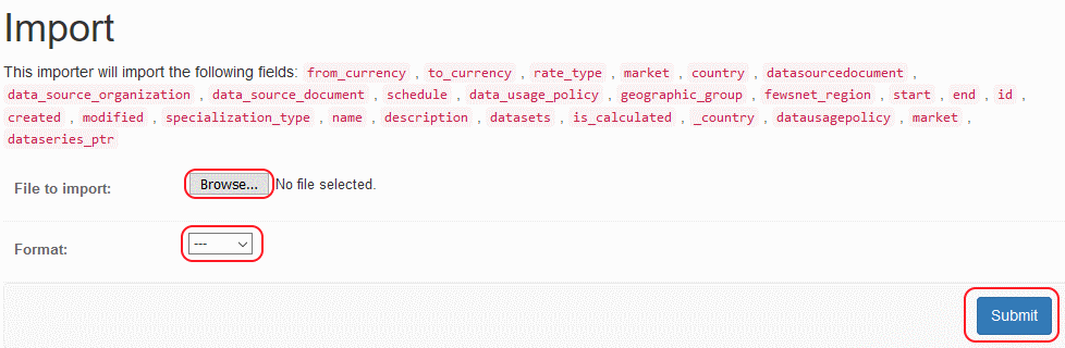 Users can upload/import a bulk file containing columns from_currency, to_currency, rate_type, market, country, datasourcedocument, data_source_organization, data_source_document, schedule, data_usage_policy, geographic_group, fewsnet_region, start, end, id, created, modified, specialization_type, name, description, datasets, is_calculated, _country, datausagepolicy, market, dataseries_ptr and upload into the system using the Import functionality.