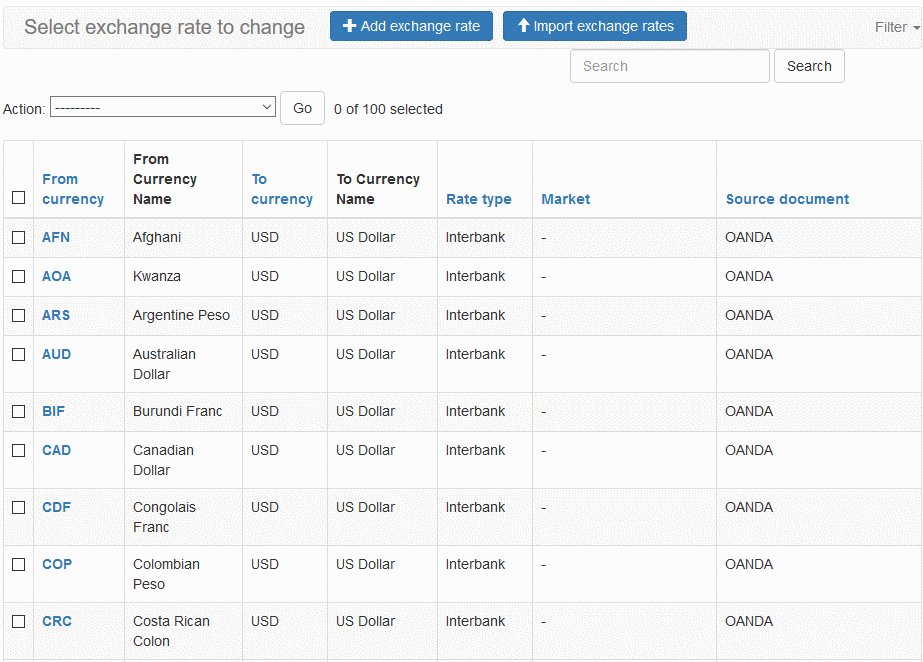 An exchange rate data that is available in a file with various formats (XLS, CSV, TSV, JSON, YAML) can be directly imported into the system using the Import functionality.