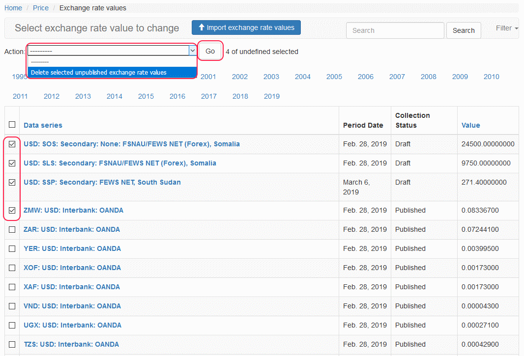From the Action drop-down list at the top, select Delete selected unpublished Exchange Rate Value