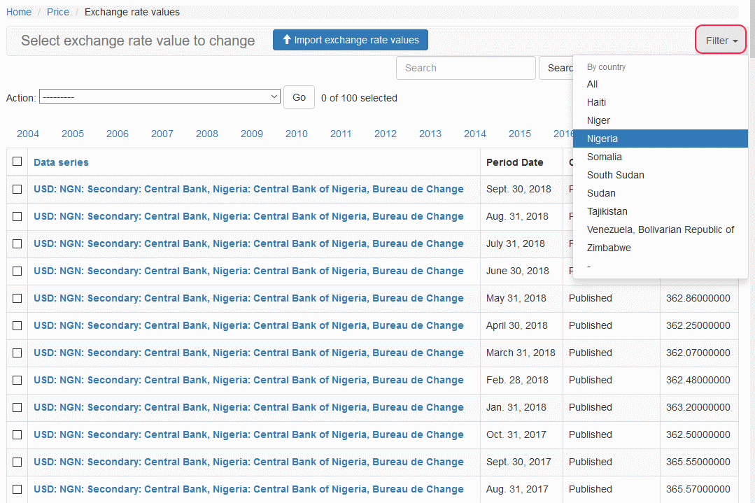 In addition to searching the Exchange Rate Value records with a free-text criteria, the system also allows you to Filter the records by specifying the Country