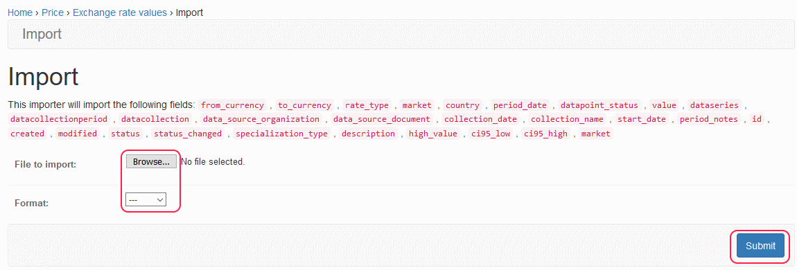 Import exchange ratepage where you can upload the file and specify the file format/type by selecting a value from theFormatdrop-down list.Click on the Submit button to start the import process.