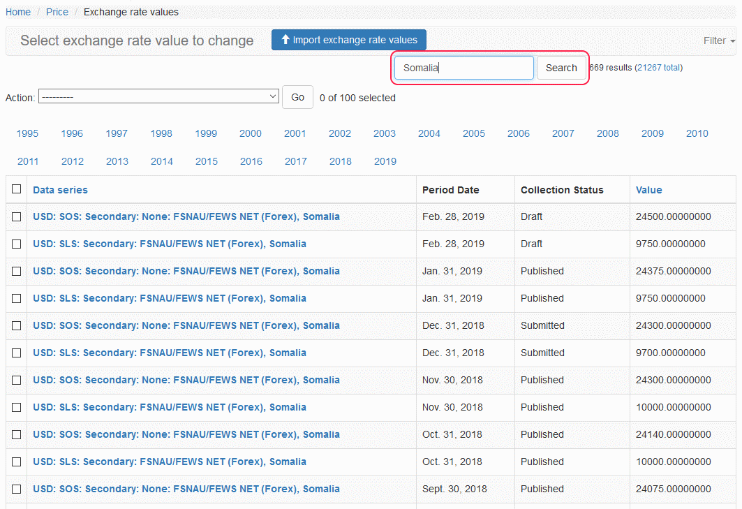 You can search the list by entering a search criteria in the Search text-box at the top of the Exchange Rate Value page and clicking on the