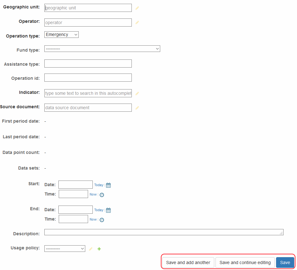 This is a screen where a user can add new Response data by providing the geographic unit, operator, operation type, Indicator, and source document.