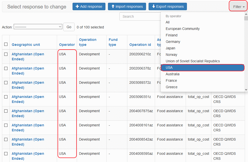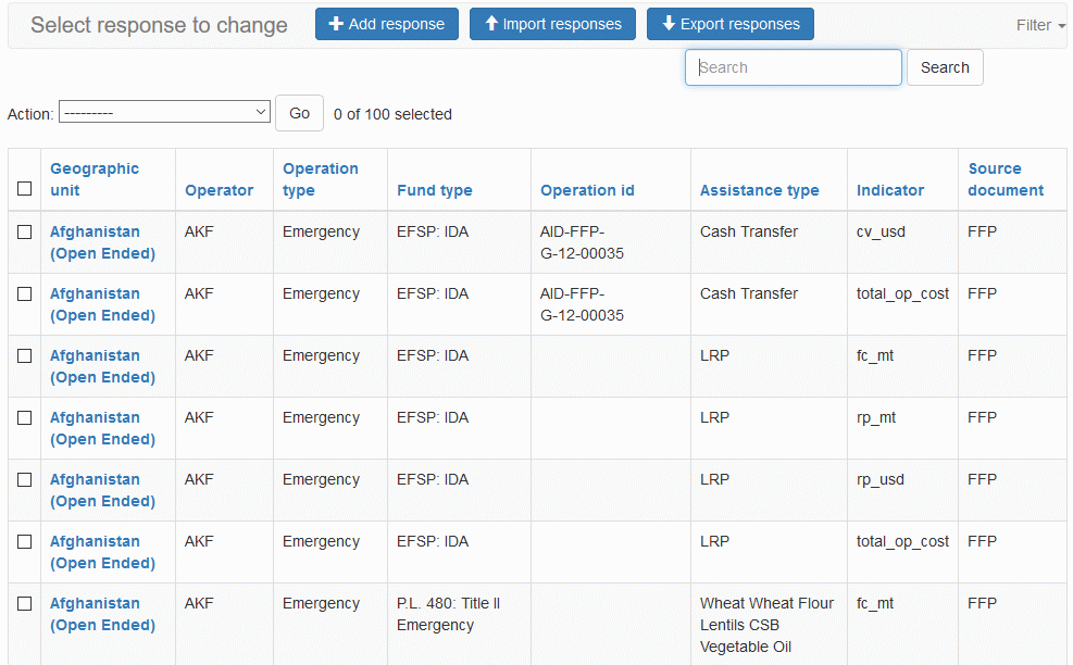 The Responses page lists the currently available Responses dataseries in a grid format (see below) with column headers: Geographic unit, Operator, Operation type, Fund type, Operation id, Assistance type, Indicator, Source document
