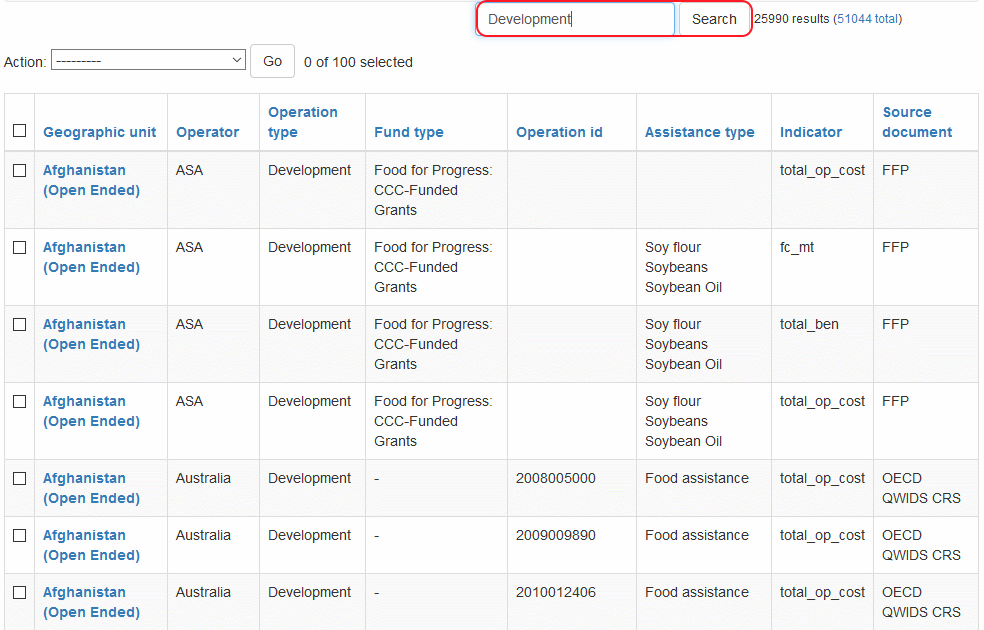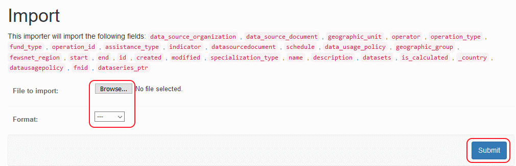 Users can upload a bulk file containing columns data_source_organization, data_source_document, geographic_unit, operator, operation_type, fund_type, operation_id, assistance_type, indicator, datasourcedocument, schedule, data_usage_policy, geographic_group, fewsnet_region, start, end, id, created, modified, specialization_type, name, description, datasets, is_calculated, _country, datausagepolicy, fnid, dataseries_ptr and upload using the Import functionality in the system.