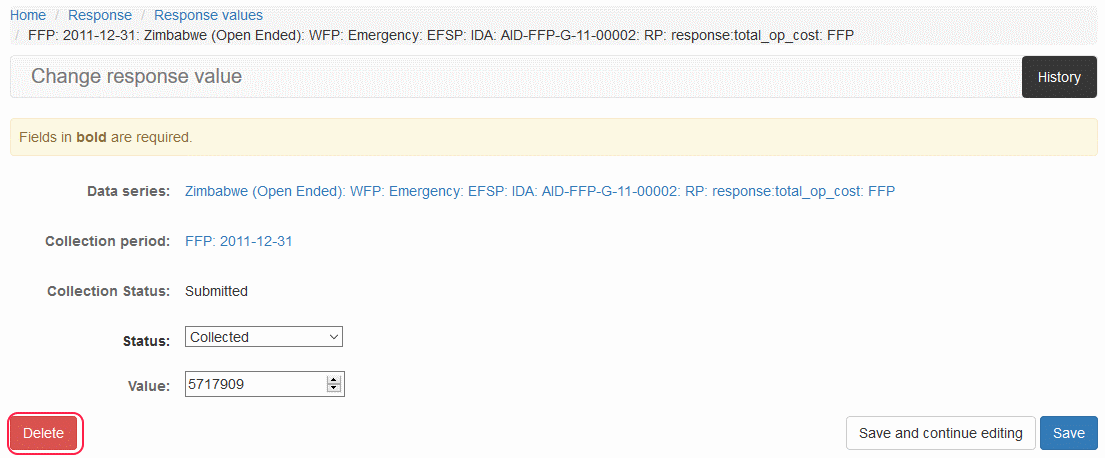 From the list in Response Value page, click on the link within the Data series column of the record you would like to view the history.
