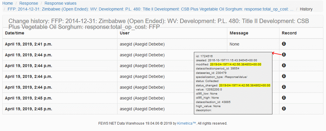 button at the top-right side of the page.Then the system displays the Change history page where you can see the details of the updates and other operations carried out against the selected Response Value record (see below)