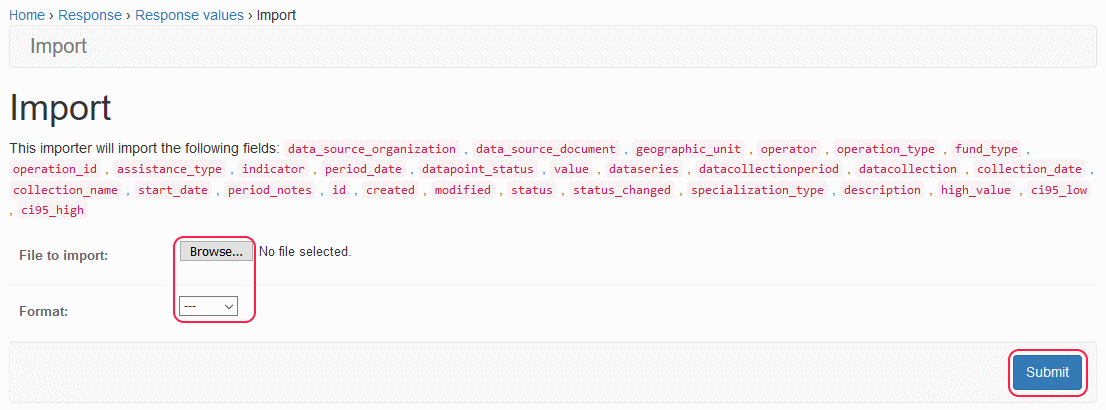 Users can upload/import a bulk file containing data_source_organization, data_source_document, geographic_unit, operator, operation_type, fund_type, operation_id, assistance_type, indicator, period_date, datapoint_status, value, dataseries, datacollectionperiod, datacollection, collection_date, collection_name, start_date, period_notes, id, created, modified, status, status_changed, specialization_type, description, high_value, ci95_low, ci95_high into the system using the Import functionality in the system.