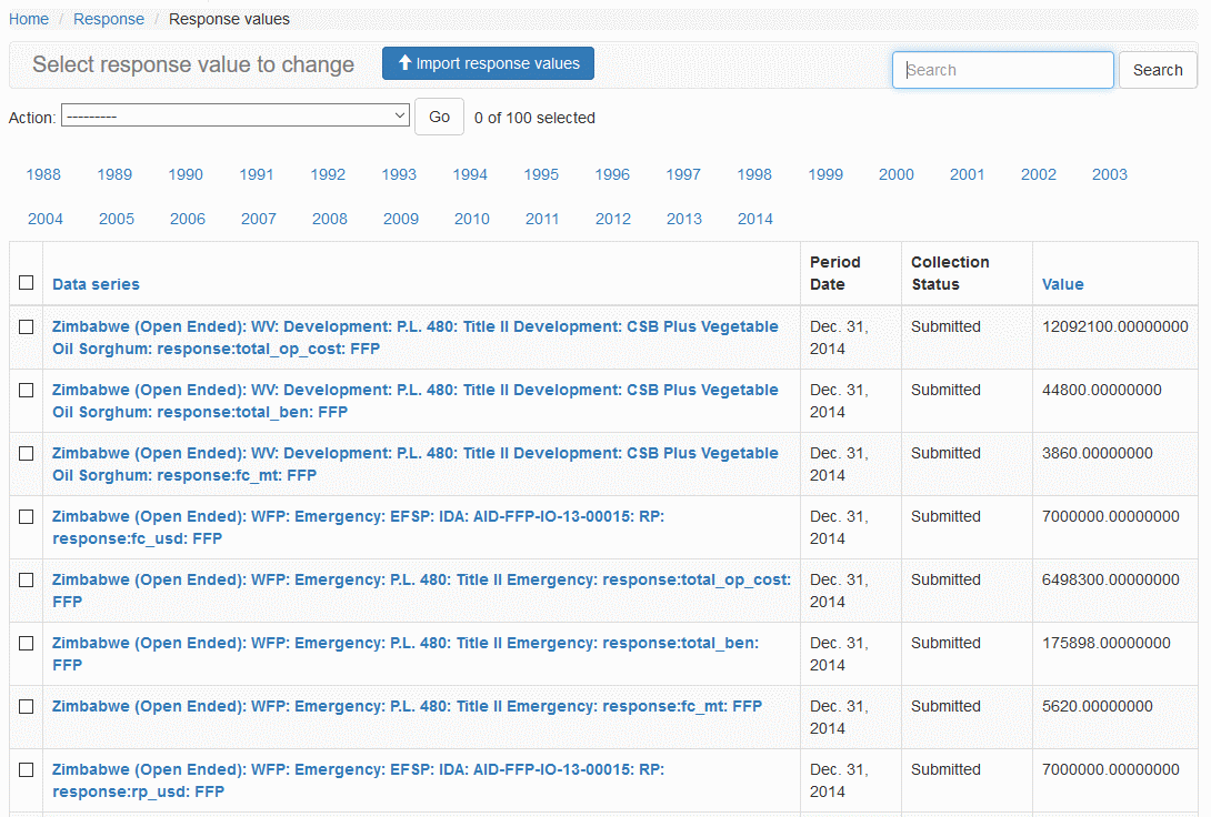 The Response Value page lists the currently available Response Values in a grid format (see below) with column headers: Data series, Period Date, Collection Status, Value