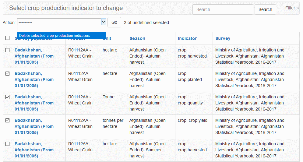 From the list in Crop Production Indicator page, select one or more Crop Production Indicator you would like to delete.