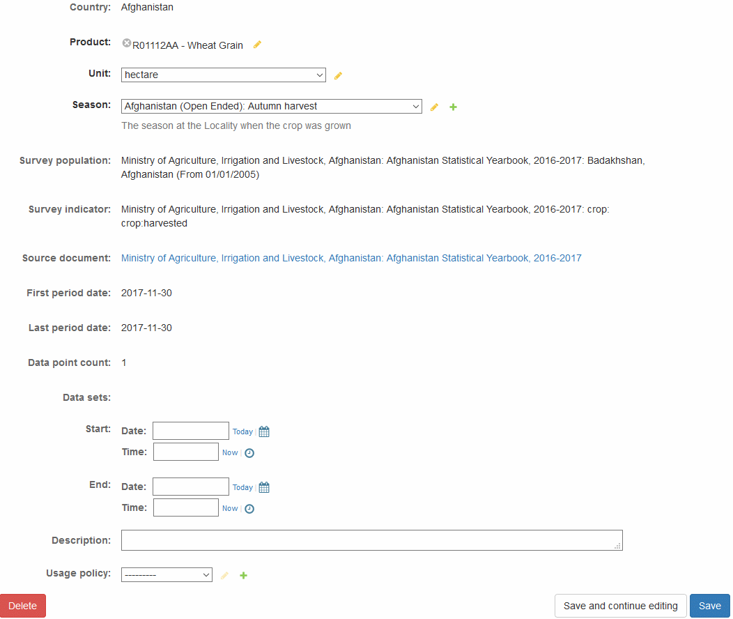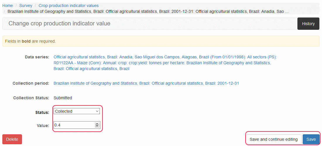 From the list in Crop Production Indicator Value page, click on the link within the Data series column of the record you would like to edit.