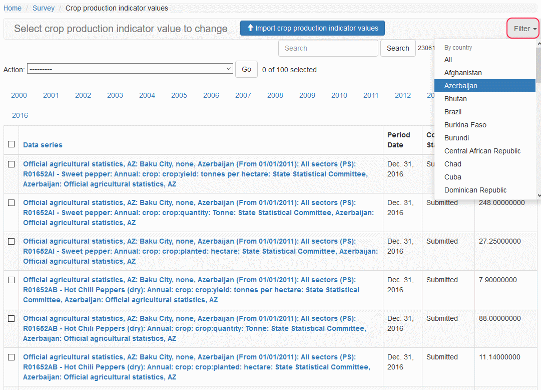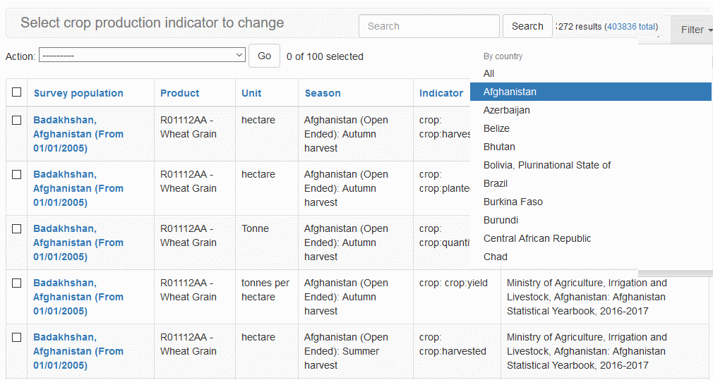 In addition to searching the Crop Production Indicator Value records with a free-text criteria, the system also allows you to Filter the records by specifying Country filter.
