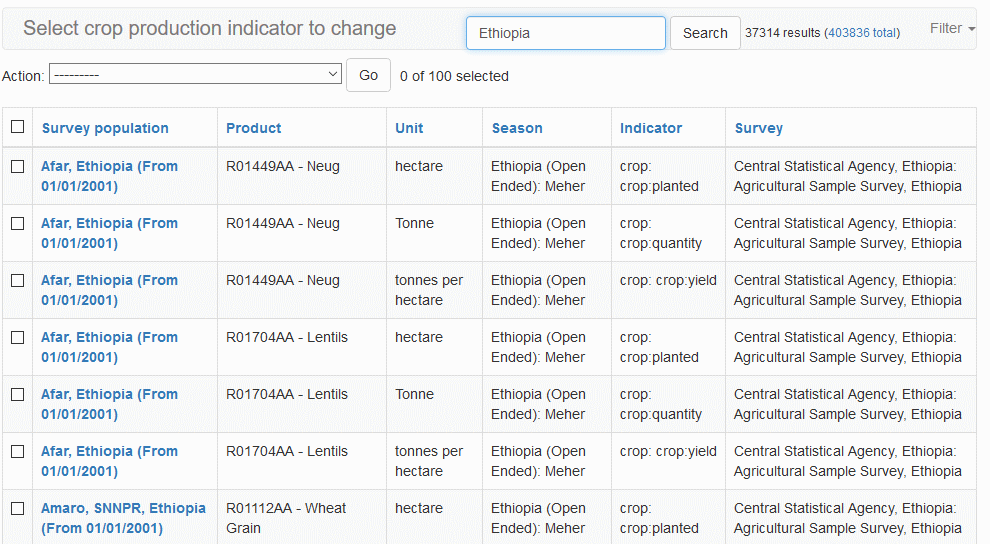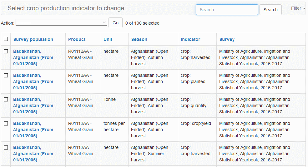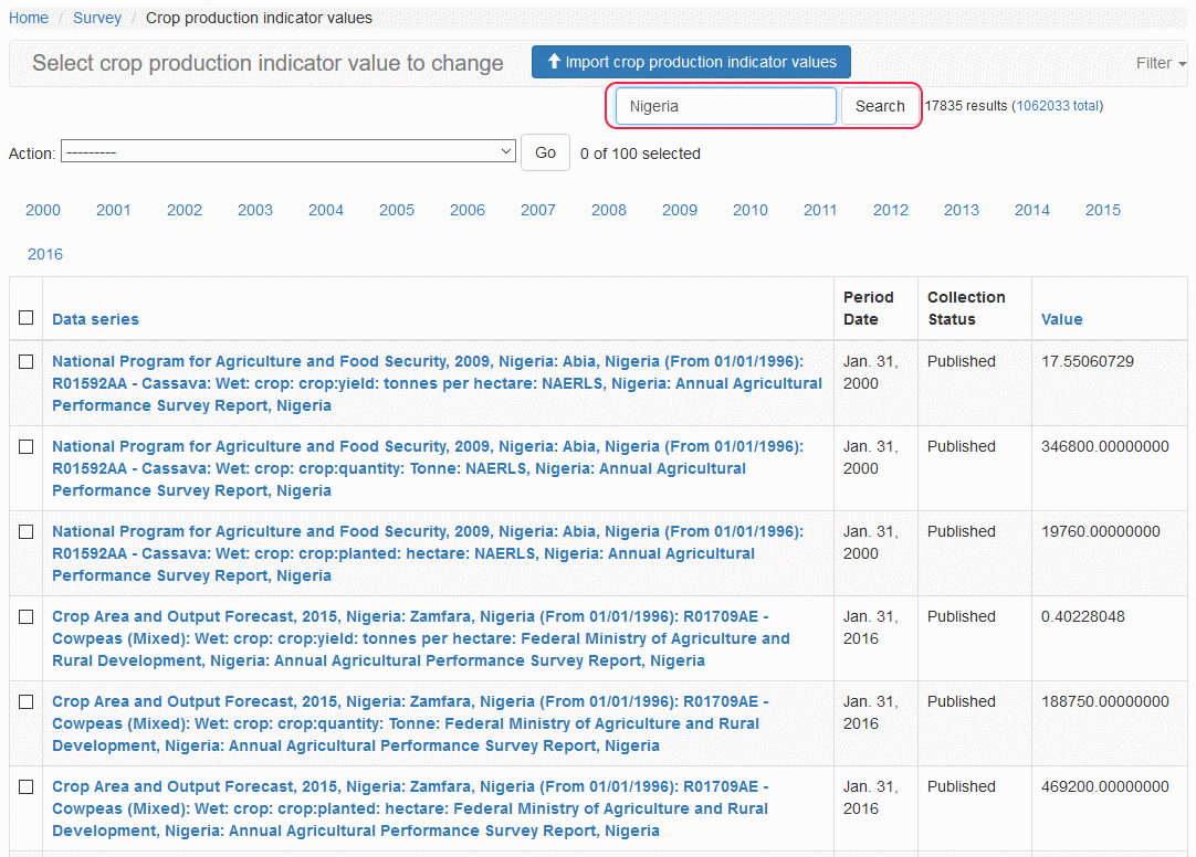 You can search the list by entering a search criteria in the Search text-box at the top of the Crop Production Indicator Value page and clicking on the
