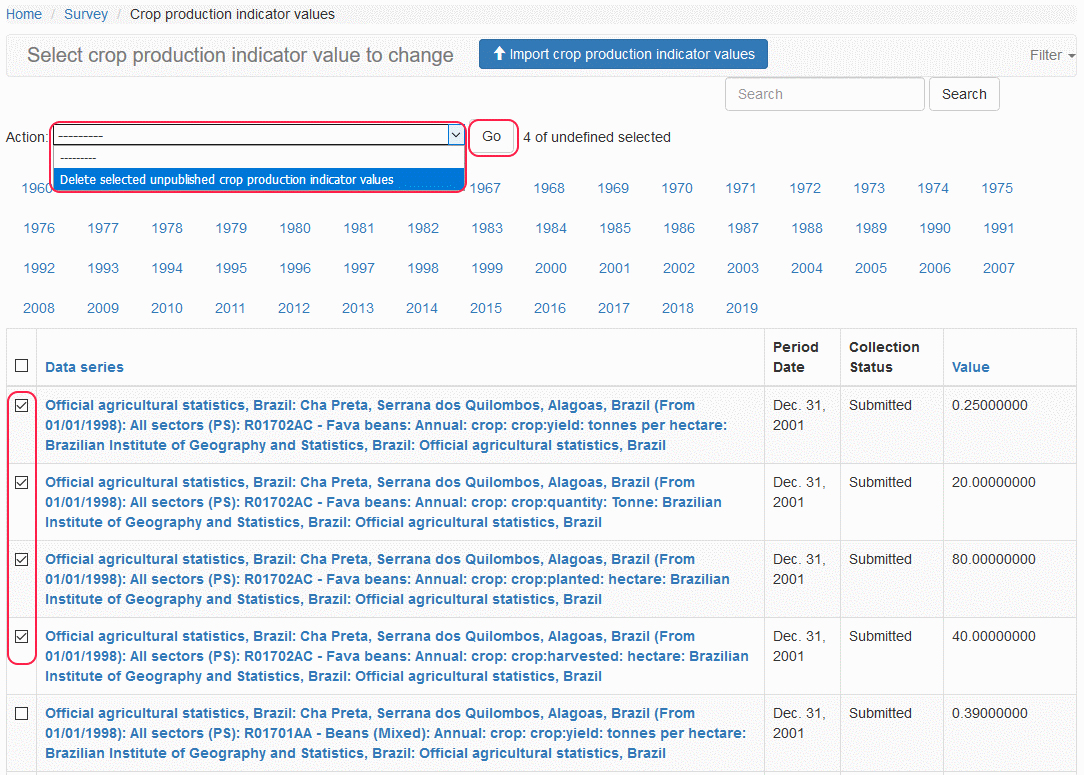 From the Action drop-down list at the top, select Delete selected unpublished Crop Production Indicator Values