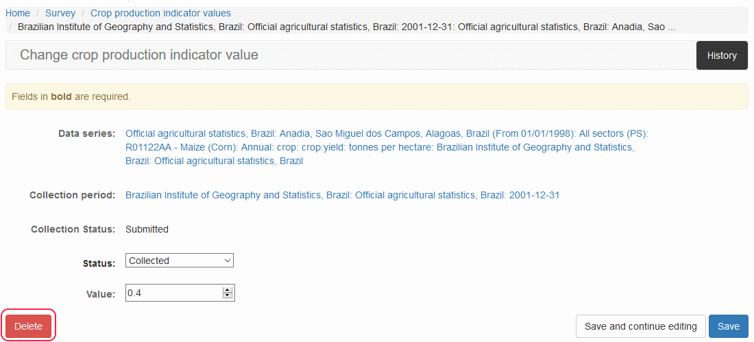 From the list in Crop Production Indicator Value page, click on the link within the Data series column of the record you would like to delete.