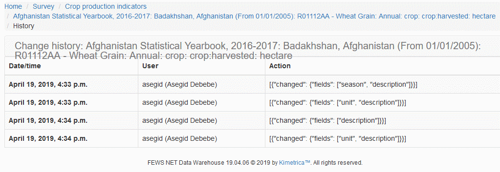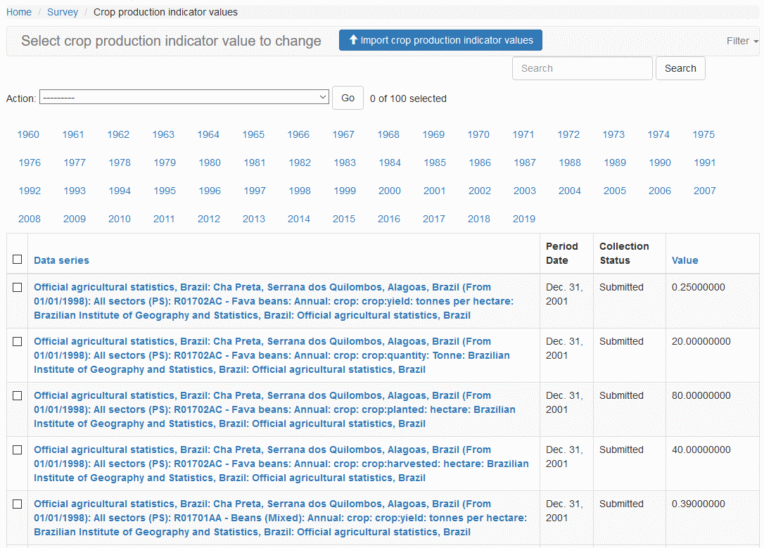 From the list in Crop Production Indicator Value page, click on the link within the Data series column of the record you would like to view the history.