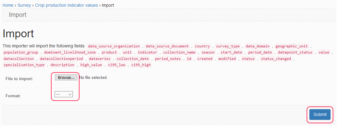 The import process creates both the dataseries and datapoints into the system from the file that is uploaded by the user. The data in the uploaded file can be in XLS, CSV, TSV, JSON or YAML format and the data in the following columns will be imported into the database: data_source_organization, data_source_document, country, survey_type, data_domain, geographic_unit, population_group, dominant_livelihood_zone, product, unit, indicator, collection_name, season, start_date, period_date, datapoint_status, value, datacollection, datacollectionperiod, dataseries, collection_date, period_notes, id, created, modified, status, status_changed, specialization_type, description, high_value, ci95_low, ci95_high