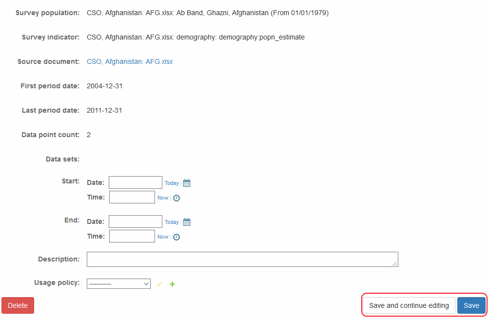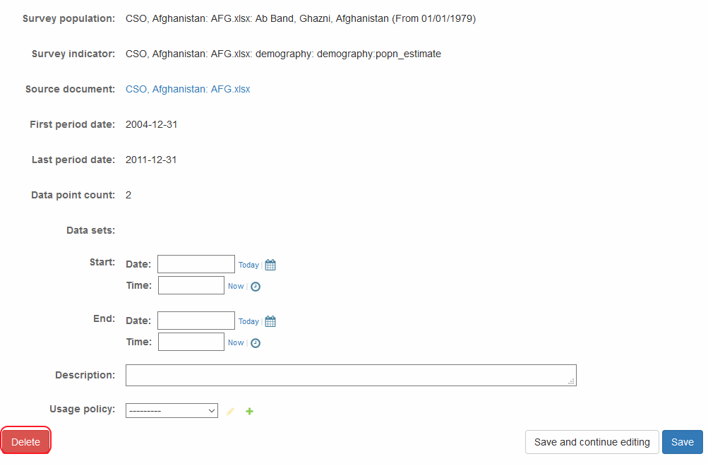 button at the bottom-left side of the page to delete the record.The system will open another page with summary information on the data you are about to delete including a list of Population Indicator datapoints that belong under the Population Indicator dataseries you selected. It will also display a prompt with a confirmation message Are you sure? and provides you with