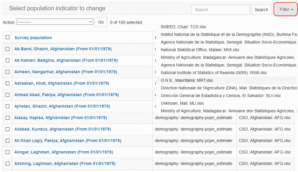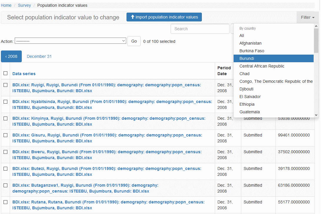 In addition to searching the Population Indicator Value records with a free-text criteria, the system also allows you to Filter the records by specifying Country filter.