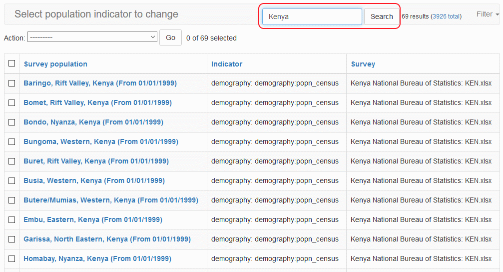 You can search the list by entering a search criteria in the Search text-box at the top of the Population Indicator Value page and clicking on the