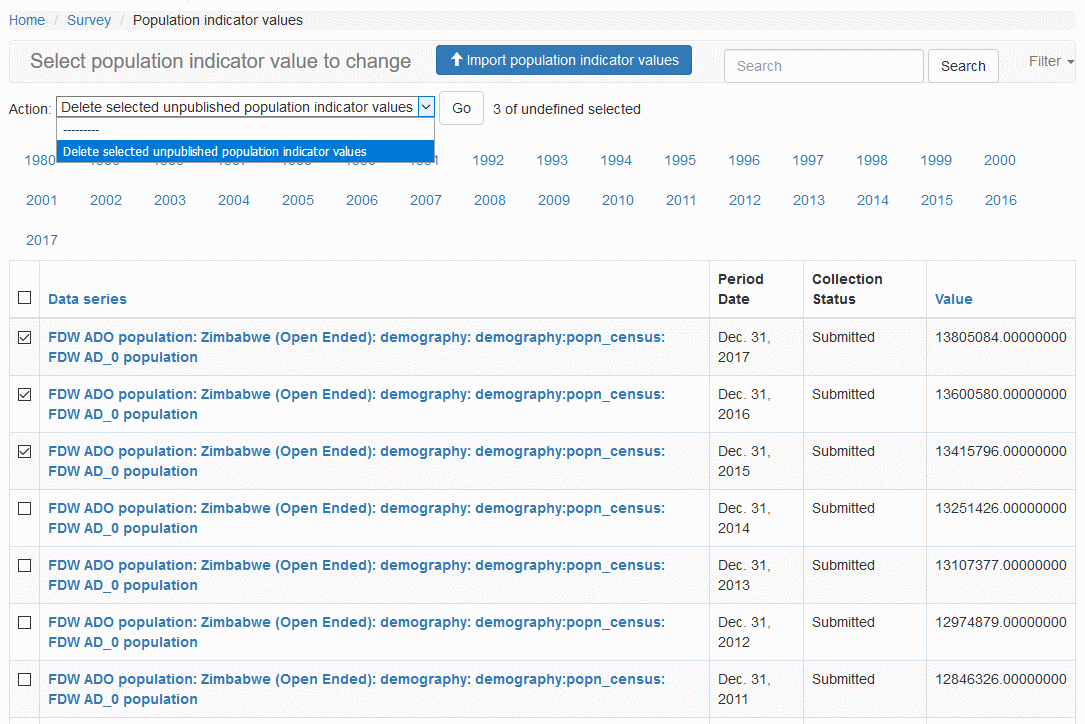 From the list in Population Indicator Value page, select one or more Population Indicator Value records you would like to delete.